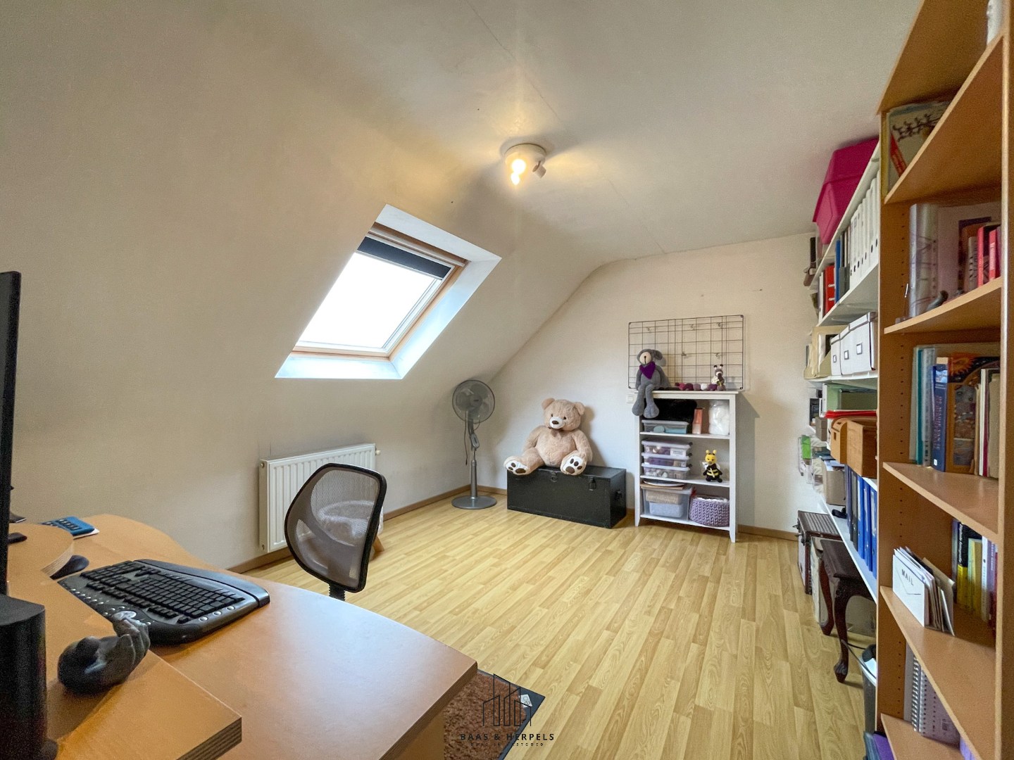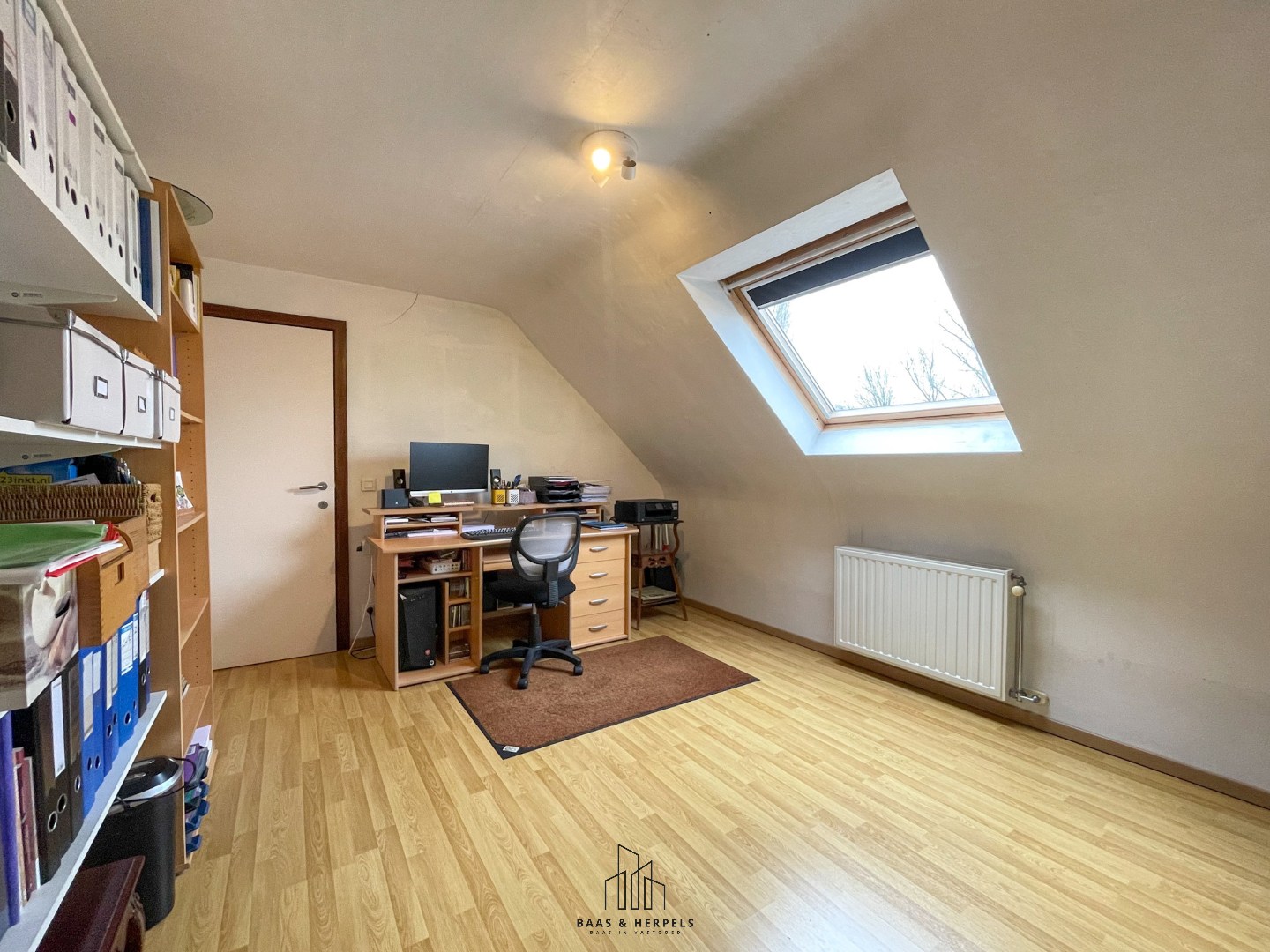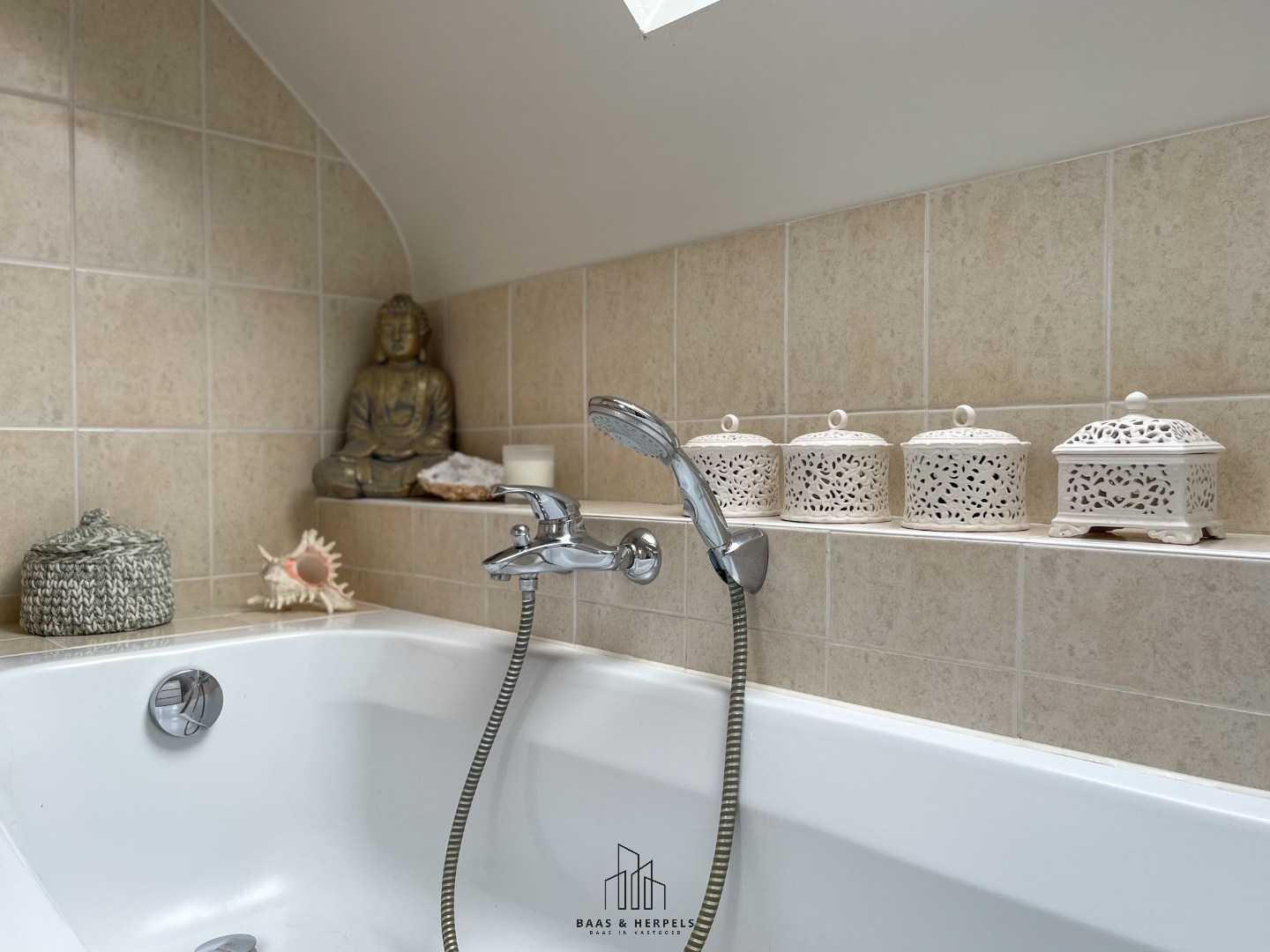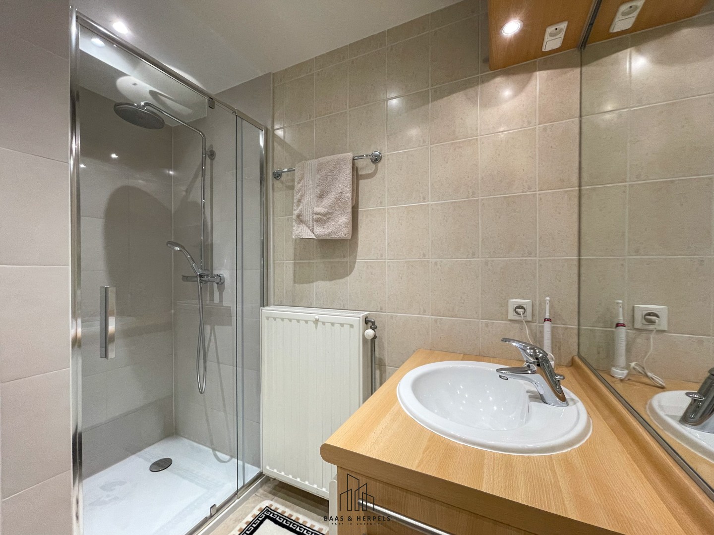 Verder in de hal treffen we de eerste badkamer aan, uitgerust met een lavabomeubel en een douche. Deze badkamer werd recent volledig vernieuwd. Hier bevinden zich ook de aansluitingen voor wasmachine en droogkast, de recent vernieuwde condensatieketel en een praktische bergruimte.