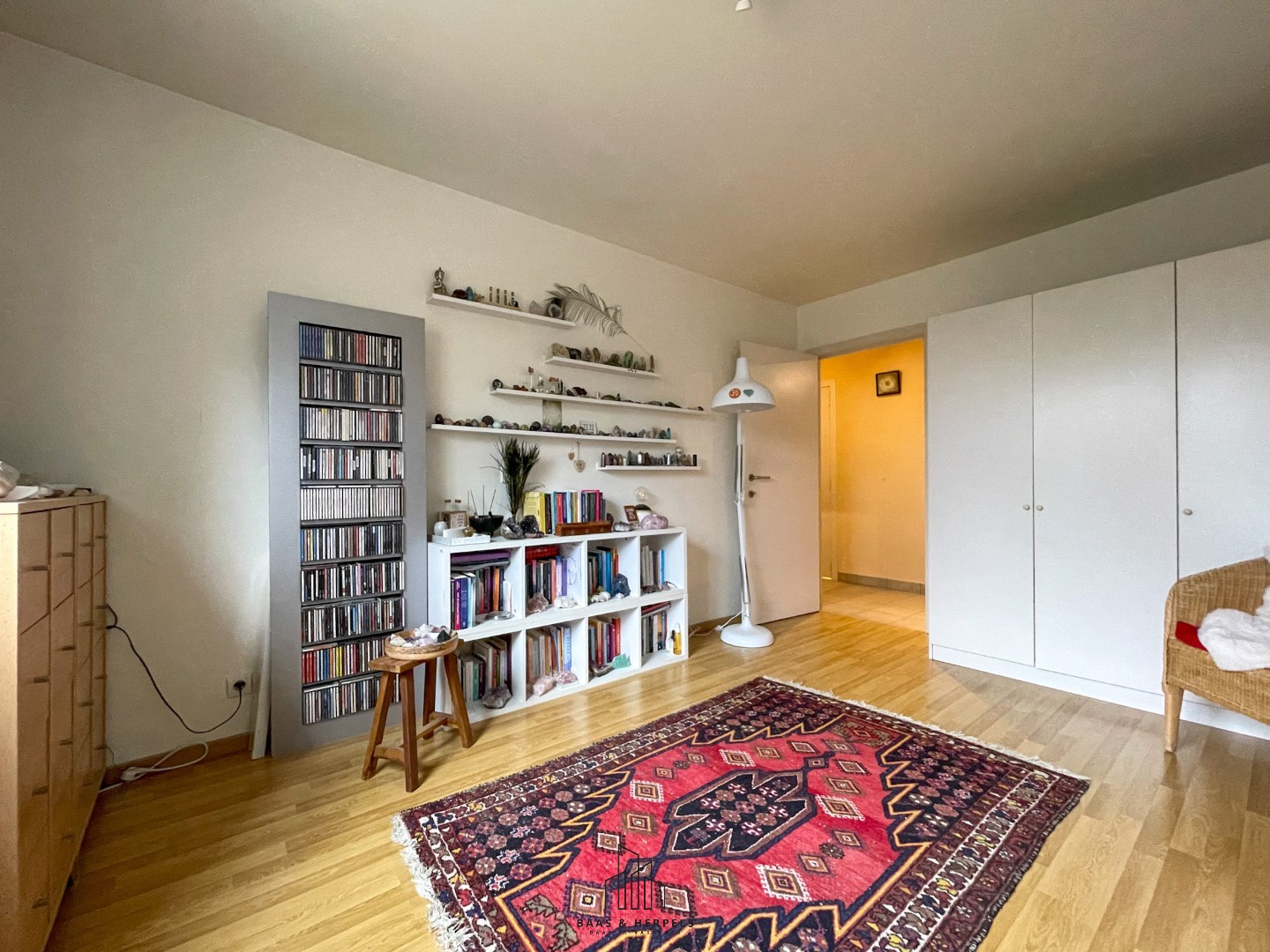 We betreden het appartement via een ruime inkomhal met gastentoilet en ingebouwde vestiairekast. Vervolgens heeft u een eerste, volwaardige slaapkamer die uitkijkt op de Groene Long van Kuurne en die ook perfect kan dienen als bijvoorbeeld bureauruimte of hobbykamer. Dankzij de zuidwestgerichte oriëntatie geniet deze kamer – net als de rest van het appartement – van een overvloed aan natuurlijk daglicht.