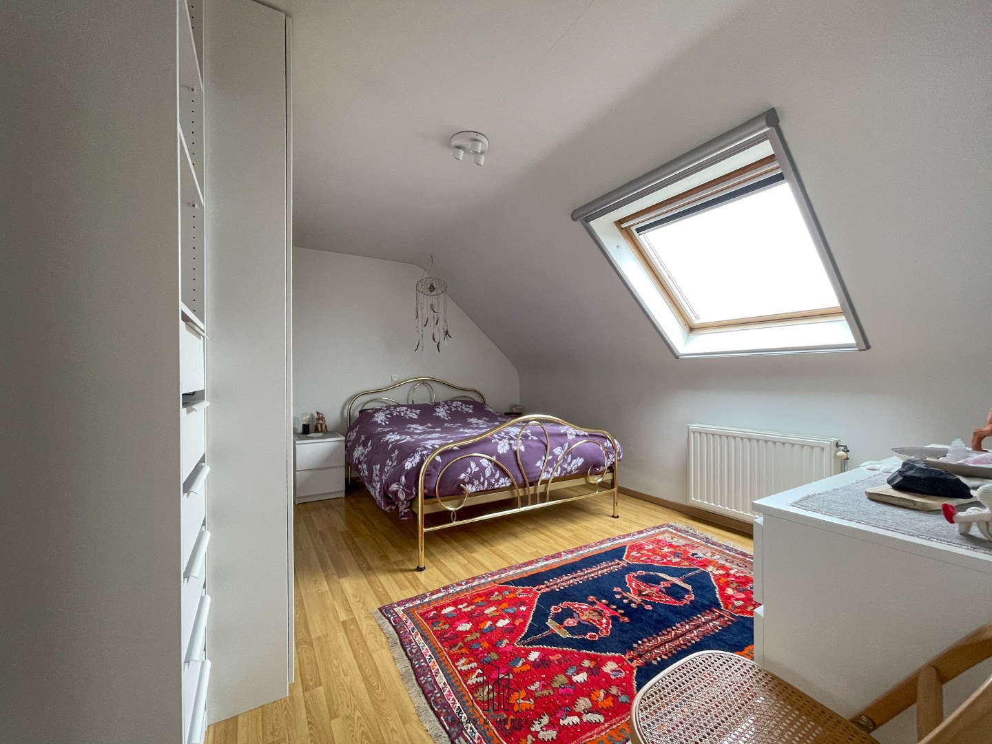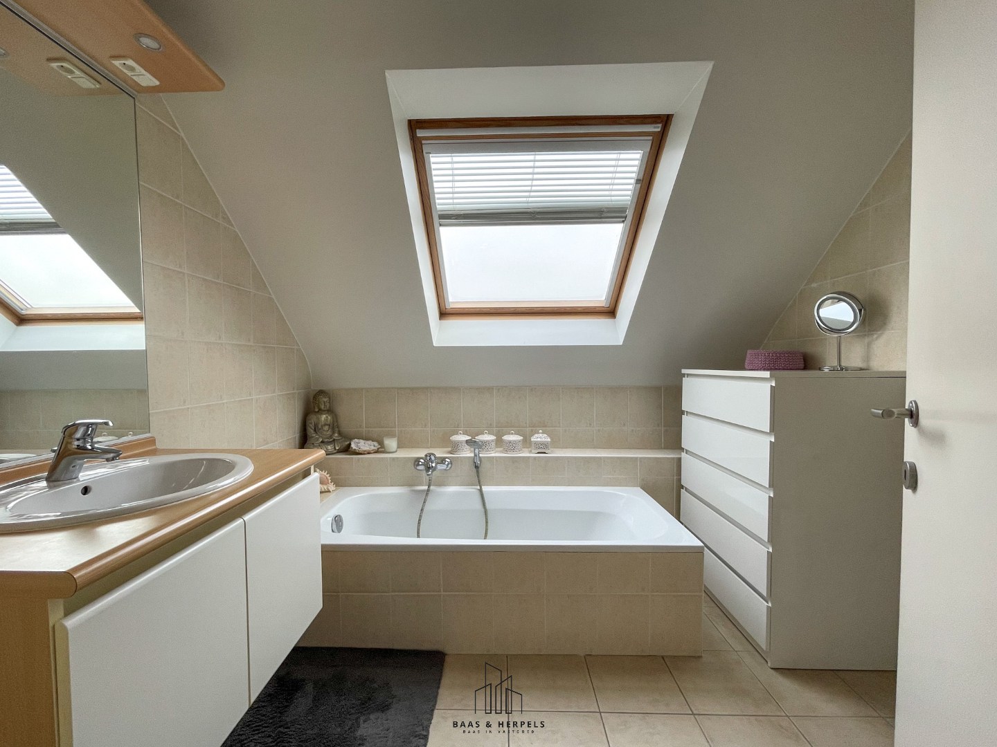 Een vaste trap in de leefruimte leidt ons naar de bovenverdieping, waar zich nog drie uitzonderlijk ruime en lichtrijke slaapkamers bevinden, evenals een tweede badkamer met lavabomeubel, ligbad en toilet.