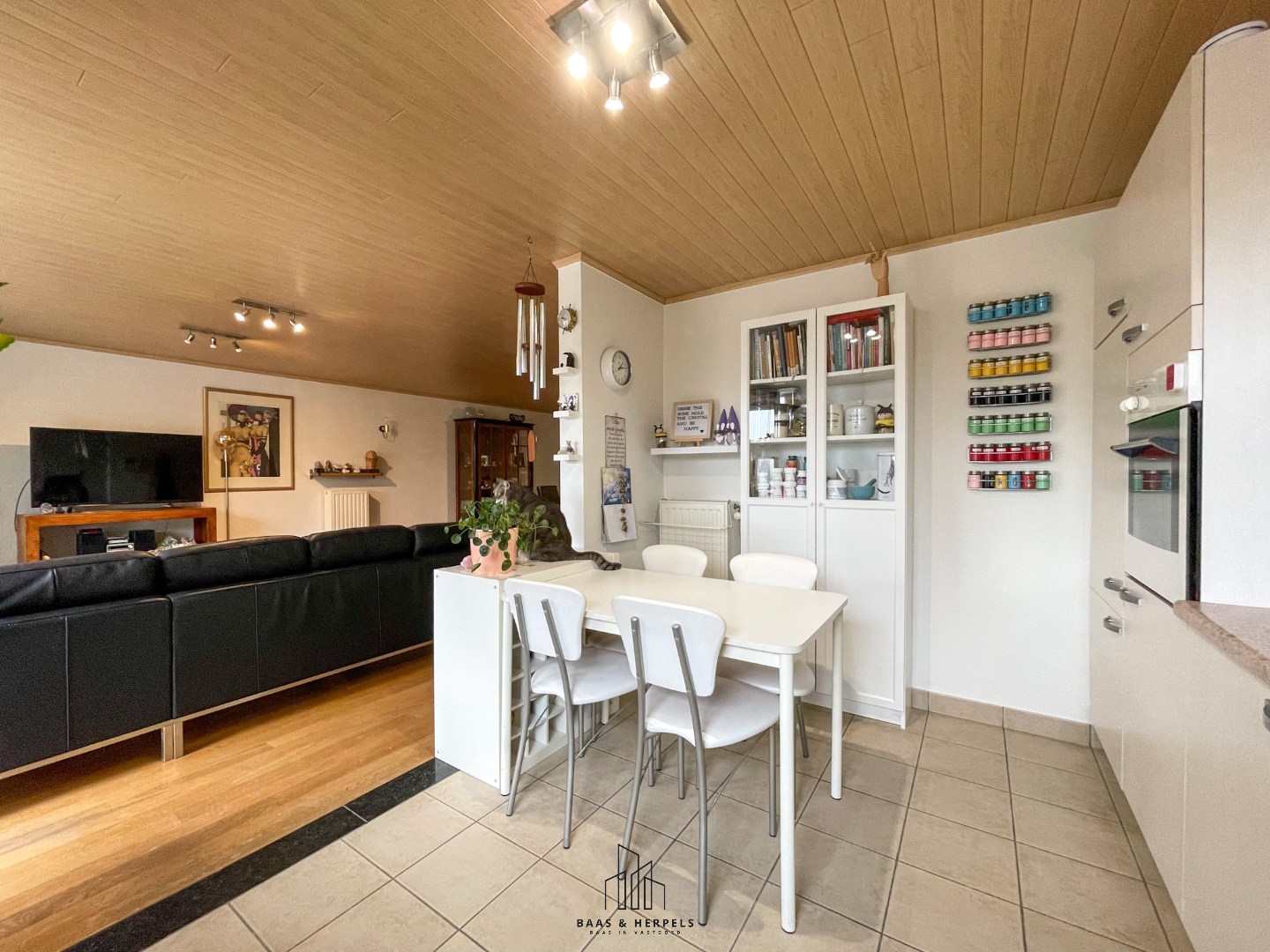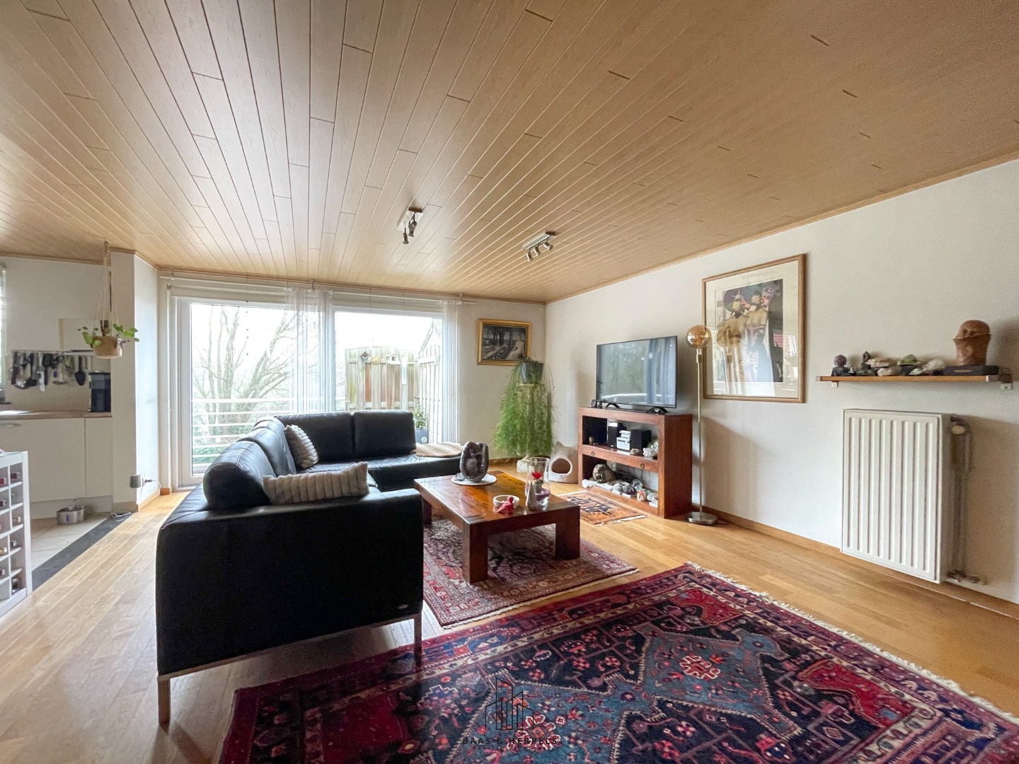 Via een glazen deur komen we in de royale leefruimte met de open keuken. Deze lichtrijke leefomgeving biedt een blijvend vrij uitzicht op het groen, wat zorgt voor rust en een aangename woonbeleving. Dankzij de ruime oppervlakte zijn er tal van mogelijkheden qua inrichting. Aansluitend bevindt zich het terras, uitgerust met een automatische zonwering met stormsensor.